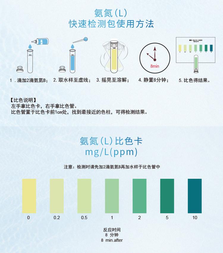 2.本產品檢測水中游離態的氨(NH3)或銨離子(NH4+)含量在0-10mg/L(ppm)范圍內,若要檢測10mg/L以上濃度水樣,請預先稀釋水樣后再進行測定,具體操作見稀釋說明書。