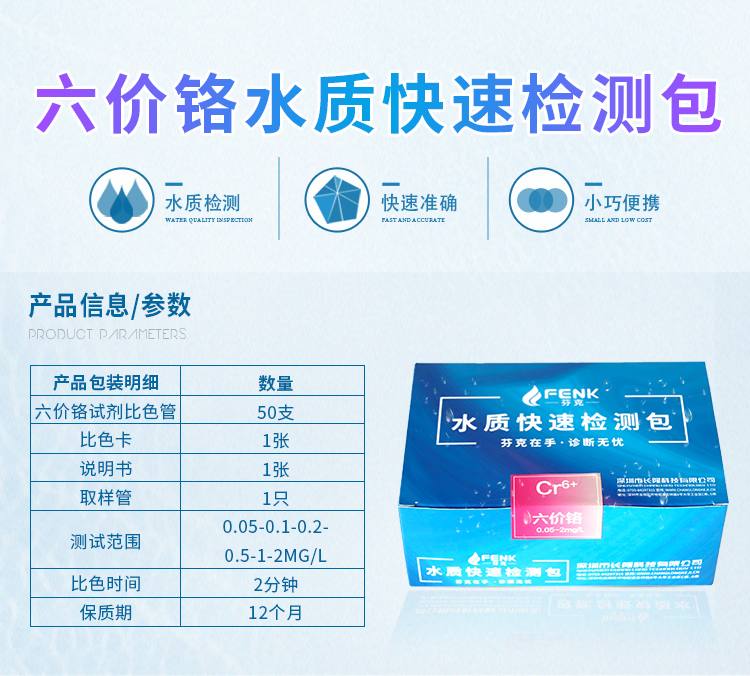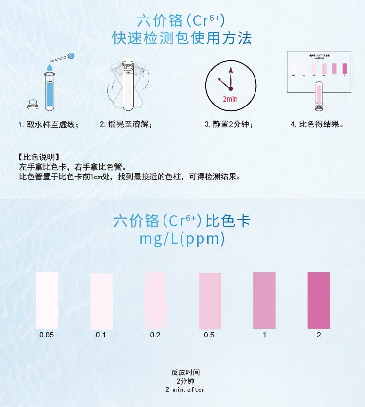 2.本產品檢測水中六價鉻(Cr)含量在0.05-2mg/L(ppm)范圍內,若要檢測2mg/L以上濃度水樣,請預先稀釋水樣后再進行測定,具體操作見稀釋說明書。