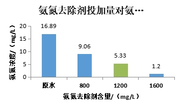 通過小試數據,氨氮的去除率隨藥劑投加濃度的增大,含量越來越低,呈線性關系,去除效果良好。當氨氮去除劑投加量為1200mg/L時,出水氨氮濃度為5.33mg/L,可達標排放。