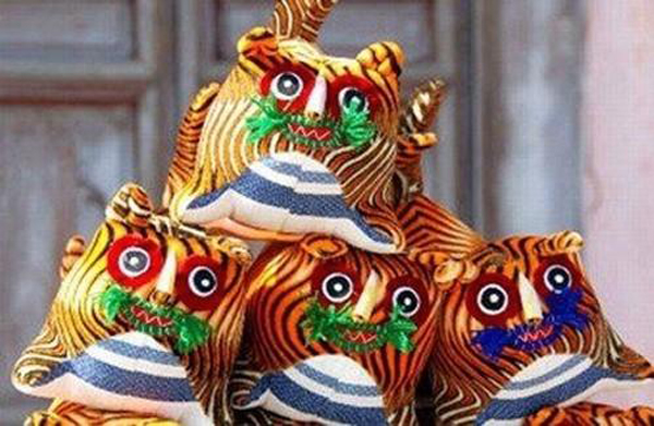 舊時端午節(jié)驅(qū)邪辟祟之物,也作裝飾品。我國古代視虎為神獸,俗以為可以鎮(zhèn)祟辟邪、保佑安寧。《風(fēng)俗通》云:“虎者陽物,百獸之長也。能噬食鬼魅,……亦辟惡”。故民間多取虎為辟邪之用,其中尤以端午節(jié)的艾虎為最具特色。艾虎或以艾編剪而成,或剪彩為虎,粘以艾葉,佩戴于發(fā)際身畔。端午節(jié)飾戴艾虎的風(fēng)習(xí)已經(jīng)有千年以上的歷史。宋陳元規(guī)《歲時廣記》引《歲時雜記》:“端午以艾為虎形,至有如黑豆大者,或剪彩為小虎,粘艾葉以戴之。王沂公《端午帖子》詩:‘釵頭艾虎辟群邪,曉駕祥云七寶車’?!庇智甯徊於爻纭堆嗑q時記》:“每至端陽,閨閣中之巧者,用綾羅制成小虎及粽子……以彩線穿之,懸于釵頭,或系于小兒之背,古詩云:‘玉燕釵頭艾虎輕’,即此意也?!?/p>