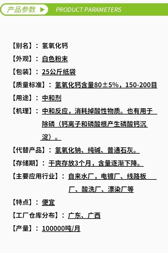 1.調(diào)節(jié)酸性污水的pH值,廣泛用于電鍍、化工、線路板、酸洗、印染、造紙等行業(yè)的污水處理;