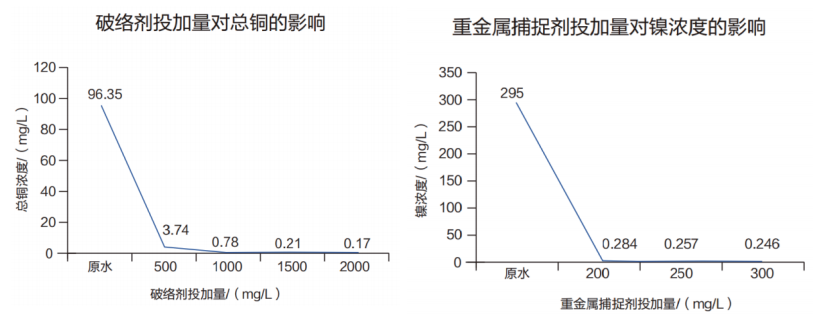 2.通過(guò)我司投加一系列配套藥劑后,達(dá)到如下效果在破絡(luò)劑投加量為1500mg/L,重金屬捕捉劑投加量為300mg/L時(shí),出水總銅降至0.21mg/L、總鎳降至0.246mg/L、總磷穩(wěn)定在1.0mg/L、總氮穩(wěn)定在15mg/L;